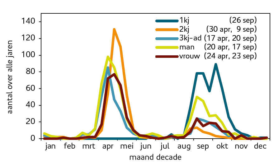 Een adulte man Steppekiekendief is met zijn grijswitte verenkleed en zwarte wig in de vleugelpunt onmiskenbaar. Vrouwtjes en onvolwassen vogels zijn lastiger te onderscheiden, maar zijn dankzij de goede camera’s van tegenwoordig via foto’s vaak ook op geslacht en leeftijd te brengen. Van 57% van de vogels was er redelijke consensus over het geslacht en van 44% over de leeftijd, genoeg om het seizoenspatroon voor verschillende klassen uit te splitsen (figuur 4).